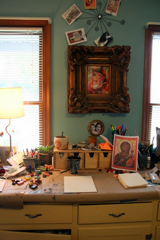 As the icon starts taking form I add and remove layers of wax to create color, form and texture. If I get stuck I usually take a break for several hours or work on something else to give myself a fresh perspective. Sometimes, asking my 8 and 5 year old boys what they think, can be productive and at times humorous! Over the course of several days the icon takes shape.