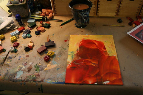 Once this step is completed and I am happy with the result, I heat up the encaustic stylus and start creating a general color outline.