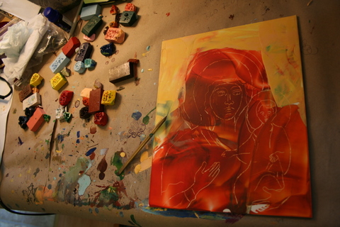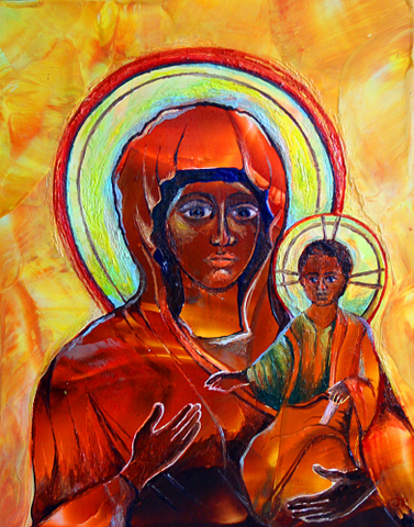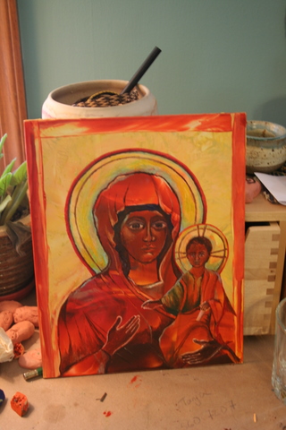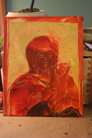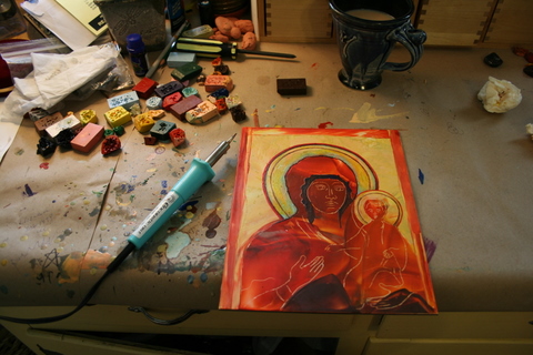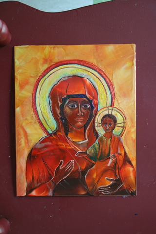 The icon that I chose to work with is “The Ethiopian Madonna and Child” brought to the west by Constantine in 1046. According to church tradition, she was painted by the Evangelist Luke. My first step was to apply general color on a 8by10 clay board using an encaustic iron and a selection of waxes.